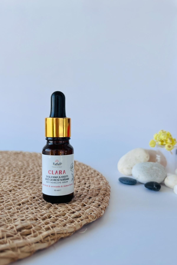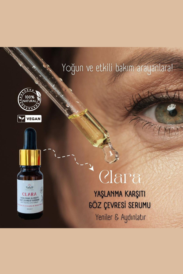 Ölmez çiçek, deve dikeni ve avokado gibi doğal lifting etkili yağ içerikleri sayesinde göz kapağına daha sıkı ve şekillenmiş bir görünüm kazandırmaya katkı sağlar. Hodan ve avokado yağları kolajen üretimini arttırarak göz çevresindeki ince çizgi ve kırışıklık görünümünün azalmasını destekler. Pirinç kepeği, tıbbi lavanta ve servi yağı, göz çevresindeki koyu halka ve şişkinlik görünümünün azalmasına ve cildin aydınlık görünmesine yardımcı olur. Doğal antioksidanlar, çoklu doymamış asitler, cilde faydalı B1,B2, B3, A ve E vitaminleri ve minerallerce zengin içeriği ile Clara yaşlanma karşıtı göz çevresi serumu; ciltteki serbest radikalleri sayıca düşüren yağ proteinleri sayesinde cildin dolgunlaşıp gençleşmesini sağlar. UV ışınlarının neden olduğu oksidatif stresin önlenmesinde etkilidir. Zamanla göz çevresi elastikiyetinde artış, çizgi ve kırışıklık görünümünde azalma sağlar ve daha parlak, ışıltılı bir cilt yüzeyi oluşturur.