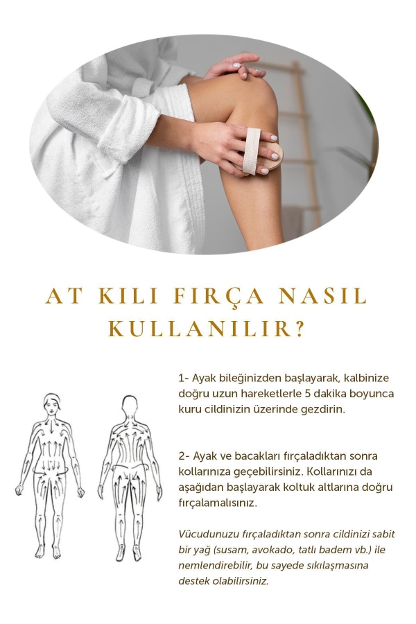 Doğal At Kılı Fırçası ile bacaklara yapılan masaj, dolaşımı hızlandırmaya ve selülüt oluşumunu en aza indirmeye yardımcı olur.