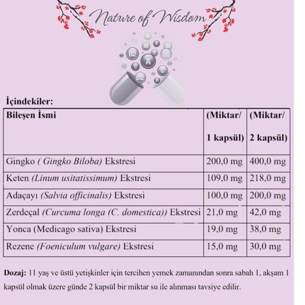 Gingko ( Gingko Biloba) Ekstresi, Keten (Linum usitatissimum) Ekstresi, Adaçayı (Salvia officinalis) Ekstresi, Zerdeçal (Curcuma longa (C. domestica)) Ekstresi, Yonca (Medicago sativa) Ekstresi,Rezene (Foeniculum vulgare) Ekstresi