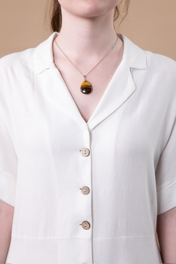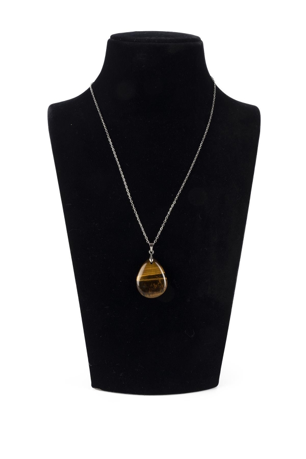 Damla şeklinde doğal kahverengi kaplangözü taşı ve çelik zinciriyle tasarlanmış kolyedir.