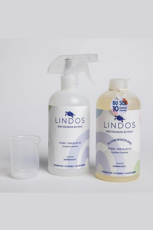 Püskürtücü kapaklı 6OOml’lik boş şişeye ölçü bardağını kullanarak 6Oml Lindos konsantre yüzey temizleyici ekleyin. Boş şişenin geri kalanını su ile doldurun. Kullanımı: Püskürtücü kapak açık konumdayken yüzeye 3O-4O cm uzaktan püskürtün ve bez ile silin. Mobilya ve oyuncakların silinmesi için de rahatlıkla kullanılabilir. Tamamen doğal ve bitkisel içeriklere sahip formülümüzü çocuklarınız ve evcil hayvanlarınızın dokunduğu her yüzeyde güvenle kullanabilirsiniz.