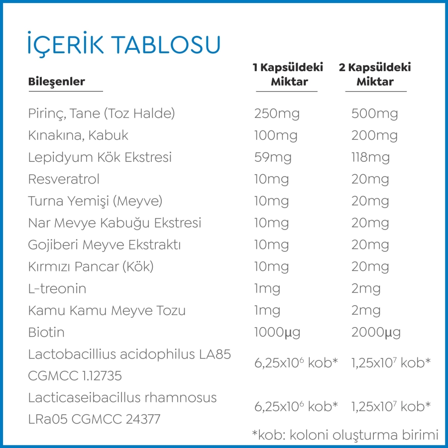 Lactobacillius acidophilus LA85 CGMCC 1.12735, Lacticaseibacillus rhamnosus LRa05 CGMCC 24377, resveratrol, gojiberi meyve tozu, kınakına kabuğu, lepidyum (maca) kök esktresi, l-treonin, magnezyum bisglisinat, turna yemişi (cranberry), nar meyve kabuğu ekstresi, kırmızı pancar kökü, kamu kamu meyve tozu, biotin, pirinç tozu, hidroksipropil metil selüloz (E 464), yağ asitlerin magnezyum tuzları (E 470b).
