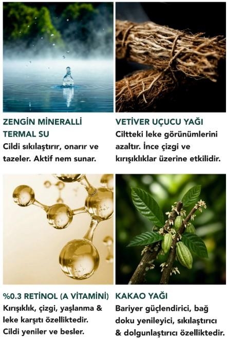 Öne Çıkan İçerikler: Termal Su, Retinol, Kakao Yağı, Kuşburnu Çekirdeği Yağı, Argan Yağı, Vetiver Yağı, Paçul Uçucu Yağı, Akgünlük Uçucu Yağı, Aronya Ekstraktı, Aynısefa Ekstraktı, Papatya Ekstraktı, Centella Ekstraktı, Jojoba Yağı, Üzüm Çekirdeği Yağı, İncir Çekirdeği Yağı, Avokado Yağı, Shea Butter, Gül Suyu, Lavanta Suyu, Huş Yaprağı Ekstraktı, Hyaluronic Acid, E vitamini