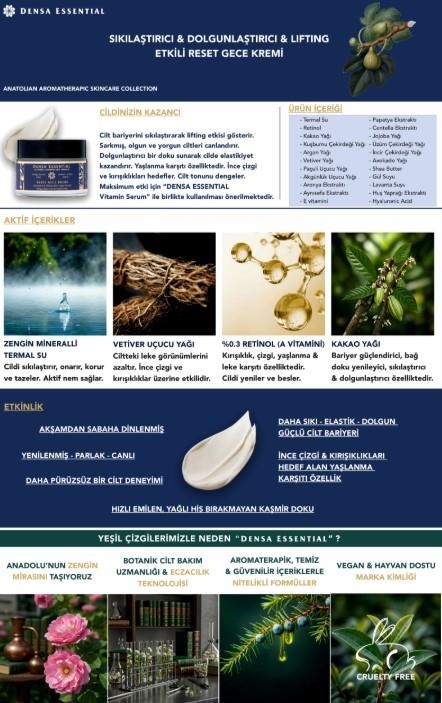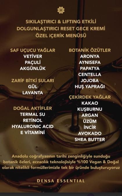 Kullanım Şekli: Uykudan önce temiz cilde iki dakika masaj yaparak uygulayınız. Tüm cilt üzerinde kullanıma uygundur. Maksimum fayda ve gözle görülür değişim için 4 ay boyunca düzenli kullanılmalıdır. Daha sıkılaştırıcı bir etki için ürünü buzdolabında saklayarak kullanabilirsiniz. Yaşlanma karşıtı bakım protokolü için uykudan önce "Aydınlatıcı & Canlandırıcı Vitamin Serum" sonrasında "Sıkılaştırıcı & Lifting Etkili Reset Gece Kremi" kullanımı önerilmektedir. Bu ürün "Yaşlanma & Kırışıklık Karşıtı Onarıcı Zengin Krem" ile birlikte kombine olarak gün aşırı kullanılabilir.