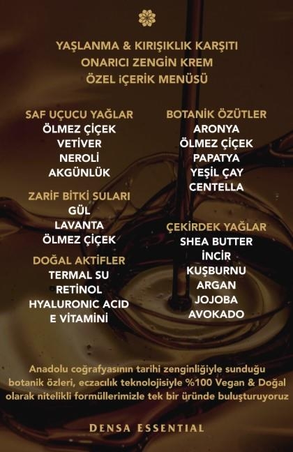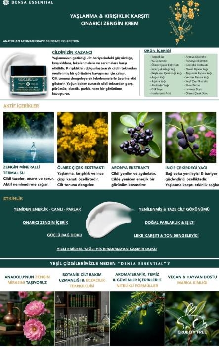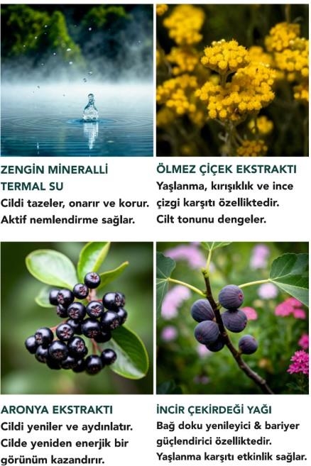 Öne Çıkan İçerikler: Termal Su, Retinol, Ölmez Çiçek Esktraktı, İncir Çekirdeği Yağı, Kuşburnu Çekirdeği Yağı, Argan Yağı, Jojoba Yağı, Avokado Yağı, Aronya Ekstraktı, Papatya Ekstraktı, Centella Ekstraktı, Neroli Uçucu Yağı, Akgünlük Uçucu Yağı, Vetiver Uçucu Yağı, Yeşil Çay Ekstraktı, Shea Butter, Gül Suyu, Lavanta Suyu, Hyaluronic Acid