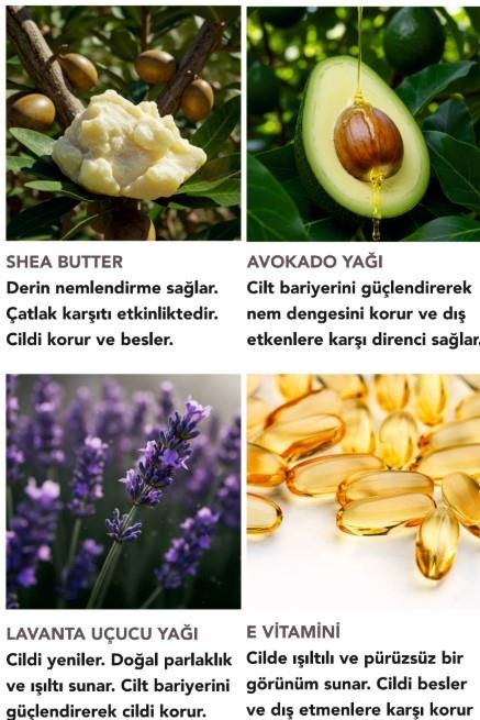 Öne Çıkan İçerikler: Shea Butter, Susam Yağı, Tatlı Badem Yağı, Kayısı Çekirdeği Yağı, Avokado Yağı, E vitamini, Lavanta Uçucu Yağı